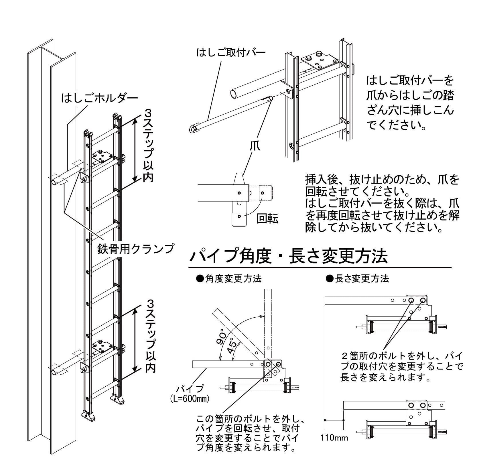 ※はしご取付け金具は、はしごの端部から3ステップ以内に取付けてください。