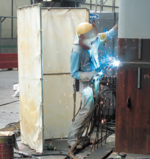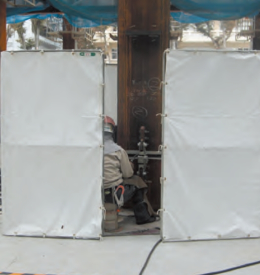 柱溶接時の火花、風養生