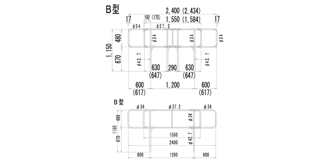 - 上桟、中桟が支柱からはねだす場合は、そのはね出しが支柱の四分の一を越えないようにし、超える場合は必ずKSメガネクランプを使用してください。